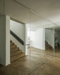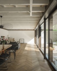 Gezielte Eingriffe erweitern die räumlichen Charakteristika des Hauses. Zwei Flügel sind orthogonal zueinander angeordnet, im einen, nördlichen, liegen Bad, Küche, Schlafzimmer, im südlichen erstreckt sich der Wohnbereich. Der Eingang wurde verlegt, von der Küche aus ist ein neuer, verglaster Terrrassenzugang geschaffen worden. Keine Flure, alle Räume sind offen miteinander verbunden, nur das Schlafzimmer hat eine Türe. Das neu arrangierte Bad mit nun separater Toilette erhielt eine verspiegelte Front, so dass sich die aufeinanderfolgenden Räume optisch zu einer getreckten Enfilade erweitern.
