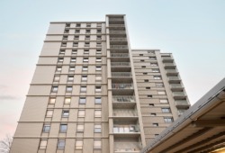 Blick von Nordosten auf das Hochhaus vor der Sanierung. Im Nachhinein sieht es aus, als würde hier die spätere Erweiterung noch fehlen, die später im Norden (links) angefügt werden sollte. (Bild. Philipp Molter)