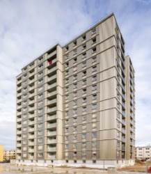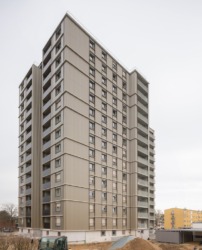Erweitert ist das 14-stöckige Hochhaus nun um drei Wohnungen je Stockwerk, so dass die Wohnungsanzahl von 58 auf 98 erhöht werden konnte. Was aber über diesen klugen Schachzug hinaus diese Sanierung so interessant macht, ist die Art und Weise, wie technische Aspekte und Erweiterung architektonisch gelöst wurden. Wesentlichen Anteil daran hat der interdisziplinären Planungsprozess zwischen der StadtBau Regensburg, studiomolter, Nemeth Stopper und der Hochschule Rosenheim. Die neue Fassade ist so aufgebaut, dass sie sich in ihre Schichten aus den Holzspanbetonsteinen des Bestands, Mineralwolle und gewelltem Aluminium sortenrein trennen lässt. Dabei sind die Aluminiumelemente bereits schon zu 92 Prozent aus Receyclingmaterial. An der Süd- und an der Westfassade wurden Photovoltaik-Elemente in die Fassade integriert, sie sind in einem an das gewellte Aluminium angepassten Champagnerton und mit matter Oberfläche gefertigt, so dass sie sich gut in die Fassade integrieren, anders als man es sonst gewohnt ist. Sie versorgen die Hausbewohnenden mit Mieterstrom.