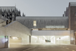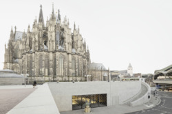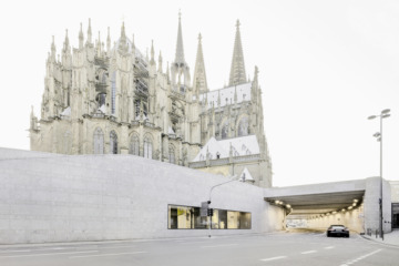 Verlässt man heute den Kölner Hauptbahnhof, betritt man einen Platz, von dem aus man über eine breit angelegte Treppenanlage zur Domplatte kommt. Diese Domplatte entstand von 1968 bis 1970 und war ein Kind ihrer Zeit: Als Fußgängerzone war sie gleichzeitig Element der autogerechten Stadt – der Verkehr floss unter der Platte, man sieht es auf Fotos des alten Zustands. 2006 ist sie neu gestaltet worden. Unberührt von den Verbesserungen blieb der Bereich im Osten des Doms. Das frühchristliche Baptisterium war mit der Domplatte verschluckt worden, unübersichtliche Ecken und Tunnelzufahrten machten diesen Teil der Domumgebung zu einem unwirtlichen Raum. In einem Workshopverfahren hatte die Stadt nach der Jahrtausendwende dieses Problem in Angriff genommen, Allmann Sattler Wappner Architekten aus München hatten schließlich mit ihrem Vorschlag überzeugt, der nun umgesetzt wurde – und so selbstverständlich wirkt, dass man sich fragt, was denn das Problem gewesen ist. (Auf den Seiten der Stadt Köln findet man Bilder, die die alte Situation zeigen >>> ) Es ist einiges mehr getan worden, als man vermutet: Teile der alten Plattform wurden abgerissen, so dass mehr Licht auf die untere Ebene fällt, auf der die Straße verläuft. Die unter dem Museum Ludwig durchführende Straße wurde von vier auf zwei Spuren reduziert, die Fußwege hat man verbreitert, den Tunnel mit weißen Oberflächen und durch eine neue Beleuchtung auch für Radfahrer und Fußgänger akzeptabel gemacht. Eine Treppe auf der einen Straßenseite führt nun direkt zum Museum Ludwig, auf der anderen akzentuiert eine lang geschwungene Treppe den Höhenversprung des Domsockels. Eine klare Kante, bekleidet mit Nagelfluh, setzt den Dom in Szene. Ein kleiner Platz mit Brunnen liegt vor dem neu gestalteten Zugang zum Baptisterium, tiefe Ausstellungsvitrinen der Dombauhütte und des Römisch-Germanischen Museums auf der einen, eine Medienwand des Museums Ludwig auf der anderen Seite werten den nun deutlich kürzeren Tunnel zusätzlich auf. (Einen vertiefenden Beitrag zur neuen Domumgebung hat die Kölnerin Uta Winterhager verfasst >>> )