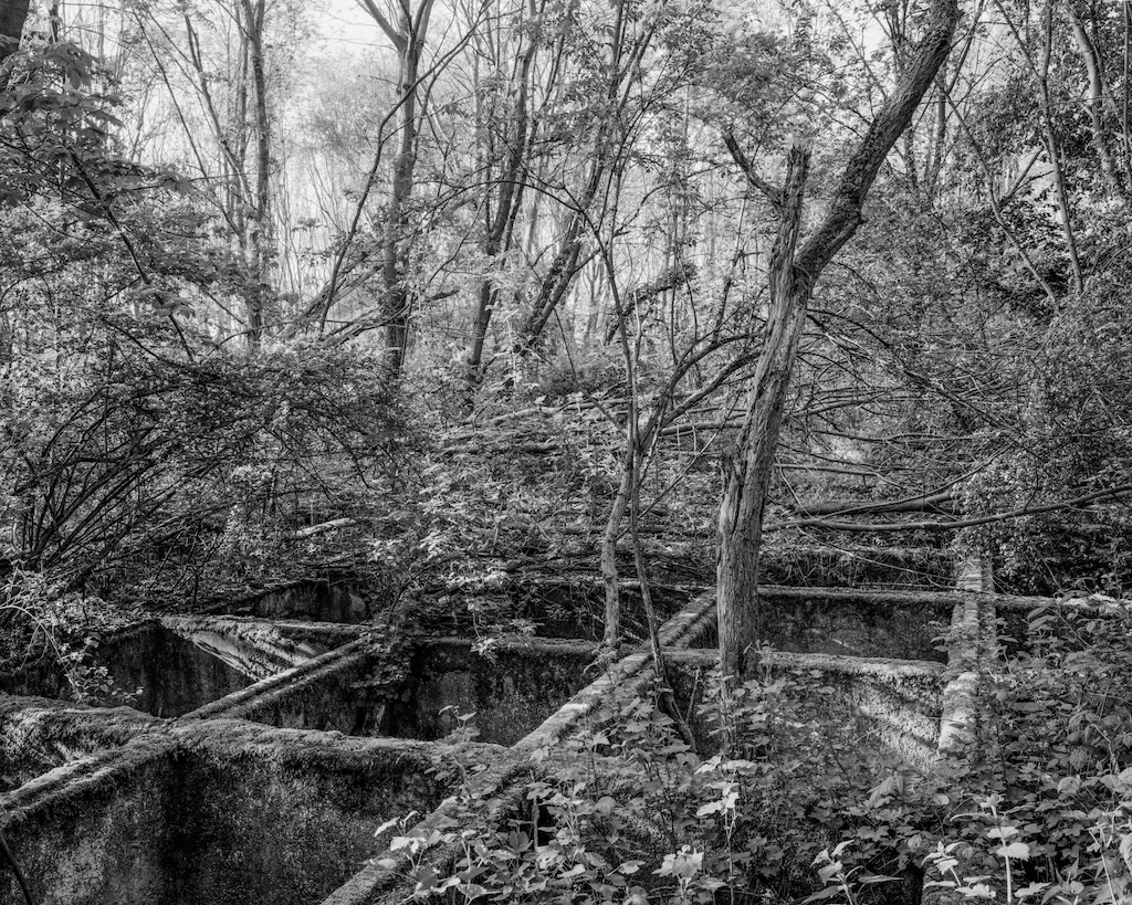 Zwischen 2017 und 2024 durchstreifte Christian Rothe mit seiner analogen Großbildkamera das riesige Areal des ehemaligen Konzentrationslagers Buchenwald auf dem Ettersberg bei Weimar. Ruinen, kaum noch erkennbare Fundamente, Treppen, Zäune, Wege bilden sich wie topographische Narben und Zeichen im undurchdringlichen Dickicht ab. Was ursprünglich tastend begann, wurde für Christian Rothe zu einer intensiven Spurensuche und Bestandsaufnahme der von der Natur überlagerten Geschichte.