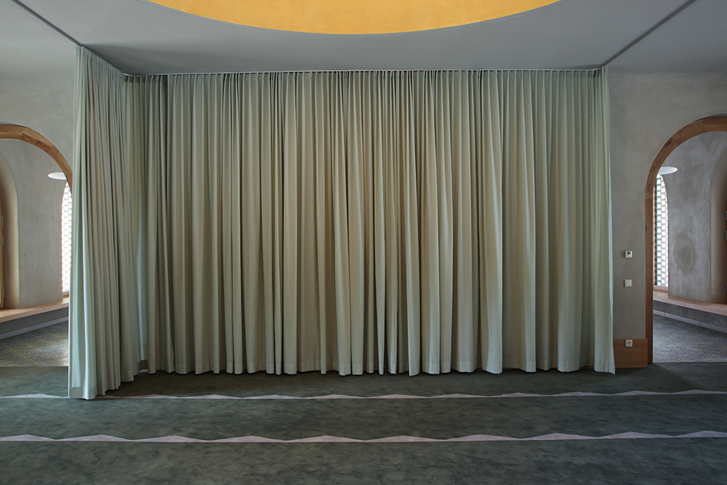 Wie in Moscheen wird auch hier auf die Trennung von Frauen und Männern geachtet: Der Gebetsraum kann bei Bedarf durch einen Vorhang geteilt werden, der Frauen und Männer voneinander trennt. Es gibt separate Zugänge für Männer und Frauen. „Die eine muslimische Bestattungskultur gibt es nicht“, erzählt Medine Altiok, die von Zürich aus arbeitet und einen türkischen Migrationshintergrund hat. Es sollte ein schlichtes Gebäude werden, erzählt Altiok. Die Planung und Umsetzung erfolgte in enger Zusammenarbeit mit den Imamen und den Vertretern der lokalen muslimischen Gemeinden. Auch stilistisch spiegelt das Wasch- und Gebetshaus auf 200 Quadratmetern die Verbindung zwischen den Kulturen wider. Zur architektonischen Besonderheit gehört das weit auskragende, asymmetrische Zeltdach, das sich wie eine schützende Kappe über den eingeschossigen Bau zieht, sowie die im Mauerwerk eingelassenen ornamentalen Muster und Kuppeln im Inneren. Öffnungen im Stile der arabischen Maschrabiyya (Fenstergitter) im Blendmauerwerk brechen das Licht, so dass eine transzendentale Atmosphäre entsteht. Der muslimische Friedhof komme so gut an, dass man schnell das zweite Grabfeld eröffnen musste, so Altiok. Denn entgegen der hiesigen christlich geprägten Kultur sind im muslimischen Kontext keine Urnenbestattungen erlaubt.