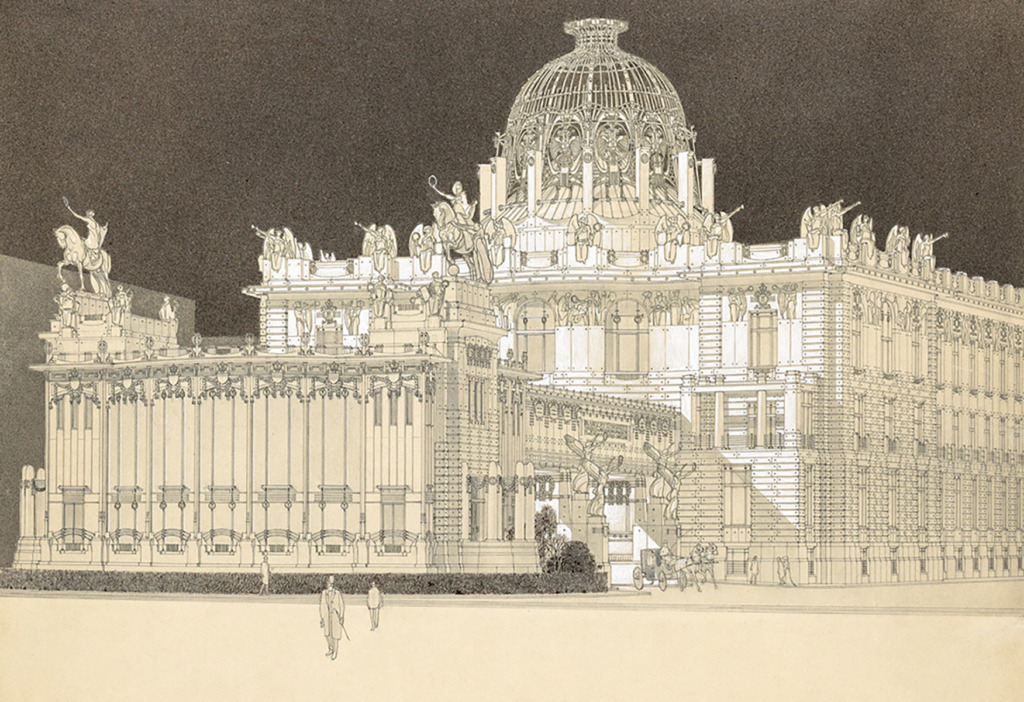 Otto Wagner, Projekt für das Stadtmuseum am Karlsplatz, 1903. Bleistift, Sepia, Weißhöhungen, Goldfarbe, 67,5 × 59,7 cm / Ausschnitt (Wien Museum, Inv.-Nr. 96.006/28)
