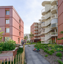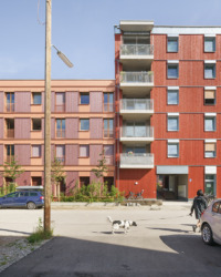 Ein ausgeklügelter Wohnungsschlüssel legte die Mischung fest: 90 Prozent Wohnen, davon 50 Prozent gefördert nach dem Münchner Modell, 20 Prozent einkommensorientierte Förderung, 20 Prozent frei finanziert, zehn Prozent Nicht-Wohnen. Der Wohnungsmix enthält verschiedene Wohnungsgrößen, von der 1- bis zur 5-Zimmerwohnung, drei Wohngemeinschaften für einen sozialen Träger finden sich unter den insgesamt 82 Wohnungen. Größere und nutzungsneutrale Räume innerhalb der Wohnungen bieten langfristige Flexibilität für die Bauherrin und die Bewohner*innen im Hinblick auf Aneignung und Anpassbarkeit. Die auf einen Laubengang gelegte Erschließung einer vorgestellten Fertigteilkonstruktion hilft, Kosten zu sparen, die Laubengänge sind aber als kommunikative Elemente zum Innenhof orientiert, an sie sind runde Balkone der Wohnungen angedockt, Vorhänge schützen sie bei Bedarf. Als Konstruktion wird eine Schottenbauweise in Stahlbeton mit Innenwänden aus Trockenbau verwendet. Die Außenhülle ist als selbsttragende Fassade in vorgefertigter Holzständerbauweise mit einer Holzbekleidung konzipiert, ergänzt teilweise mit nichtbrennbaren Fassadenbekleidungen. Die abgestufte farbliche Gestaltung schafft die Vielfalt in der Einheit. Ein modellhaftes Stück Stadtentwicklung ist entstanden, das aus der Genossenschaft eine „Keimzelle der neuen Nachbarschaft“ macht, so heißt es beim BDA Bayern, der das Projekt mit seinem Preis auszeichnete – nachvollziehbar.