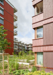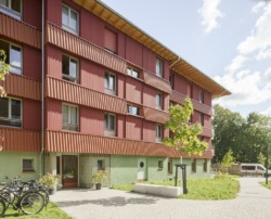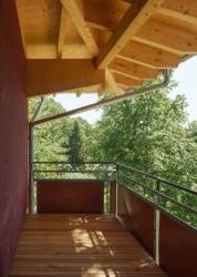 Für das dritte Projekt geht es nach Berlin, in dessen Norden, nach Pankow. Hier hat der SkF e.V. Berlin, der Sozialdienst katholischer Frauen, in direkter Nachbarschaft zu seiner Geschäftsstelle, einem Haus für die Jugendhilfe und einem Wohnhaus vor Kurzem mit einem weiteren Gebäude seinen kleinen Campus kompletiert: mit dem „Haus im Park“, das die bereits bestehenden Angebote für Menschen mit Assistenzbedarf erweitert. Der SkF widmet sich „der Unterstützung von Kindern, Jugendlichen, Frauen und Familien in besonderen Lebenslagen sowie der gleichberechtigten Teilhabe von Menschen mit Behinderungen an der Gesellschaft“. Zwischen den bestehenden Häusern wurde ein 37 Meter langer und bis zu 16 Meter breiter Neubau eingepasst, die Holzfassaden aus sägerauen Brettern der Obergeschosse sind in warmem Rot gehalten, ebenso wie die schräg gestellten Schürzen aus Wellfaserzement, die die Stockwerksfugen überdecken und dabei als Brand- wie als Sonnenschutz dienen. Das weit auskragende Dach sowie die an den Balkonen auskragenden Decken und Wände machen die Konstruktion aus Holz sichtbar und repräsentieren nicht nur die auch sonst aus Holz konstruierten Obergeschosse, sondern auch den Anspruch, auf fossile Energie zu verzichen: Photovoltaik, Solarthermie & Wärmepumpen in Verbindung mit Erdwärmesonden versorgen das Haus mit Strom und Warmwasser.