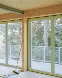 Im neuen Wohnheim sind 22 Wohnungen auf den oberen drei Geschossen verteilt, jede:r Bewohner:in hat ein eigenes Zimmer mit zugehörigem Bad, je zwei diese Einheiten sind mit einer Wohnküche und einen eigenen Balkon ausgestattet, zudem gibt es Gemeinschafts- und Entspannungesräume. Im Erdgeschoss liegt der Beschäftigungs- und Förderbereich für Menschen, die nicht, noch nicht oder nicht mehr auf dem ersten Arbeitsmarkt oder in einer Werkstatt arbeiten können, ergänzt um überdachte Außenbereiche an den Stirnseiten. Auch im Innern sind die Oberflächen warm und vom Material strukturiert, dabei wurde höchste Sorgfalt auf die Barrierefreiheit gelegt: Rollstuhl-Warteplätze in den Treppenhäusern, Durchsichthöhen in den Fenstern, Kontrastreiche Lichtschalter und Griffe, Handläufe in den öffentlichen Bereichen, Glasausschnitte im maximalen Maß, Taster und Notrufsysteme im ganzen Haus.