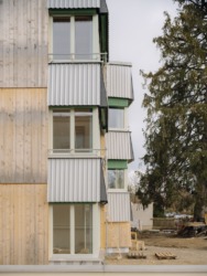 Außenliegende Treppenhäuser, (hier mit Aufzug). Balkone und Erschließung schaffen Bezüge zwischen Privatem und Gemeinschafltichem. (Bild: Markus Lanz, Sebastian Schels)