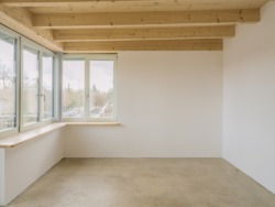Das Besondere ist aber auch das Innere, ein Holzrahmenbau mit Decken und Aufzugswänden aus Brettschichtholz. Das Sparrendach ist als offene Konstruktion sichtbar gelassen, auf Leitungen in den gedämmten Außenwänden wurde verzichtet, die Zementestrichböden sind mit Kasein behandelt und geölt, fertig. Im Erdgeschoss ist in der Nordostecke ein Gemeinschaftsraum, im Untergeschoss ein Waschraum und eine Werkstatt. In den drei oberirdischen Geschossen wurde je Geschoss eine Clusterwohnung mit gemeinsamem Wohn- und Essbereich geschaffen, für die mehrere Wohnszenarien denkbar sind. Jede Einheit ist mit Bad und Teeküche ausgestattet, die gleich großen Zimmer – ein Wunsch der Baugruppe – wurden zum den Entwurf strukturierenden Konzept. Sie sind je etwa 18 Quadratmeter groß und jeweils um Diele und Badkern gruppiert, die Konstruktion so geplant, dass Trennwände an bestimmten Stellen, Sollbruchstellen geöffnet und Räume miteinander verbunden werden können. Die Wasseranschlüsse sind so platziert, dass Küchen sehr flexibel und ohne große Umbaumaßnahmen in sechs Zimmern genutzt werden können. Für seine aneignungsoffene Präsenz nach außen braucht es den Umbau aber nicht: Das Haus sah nicht einmal vor Bezug nach Neubau aus.