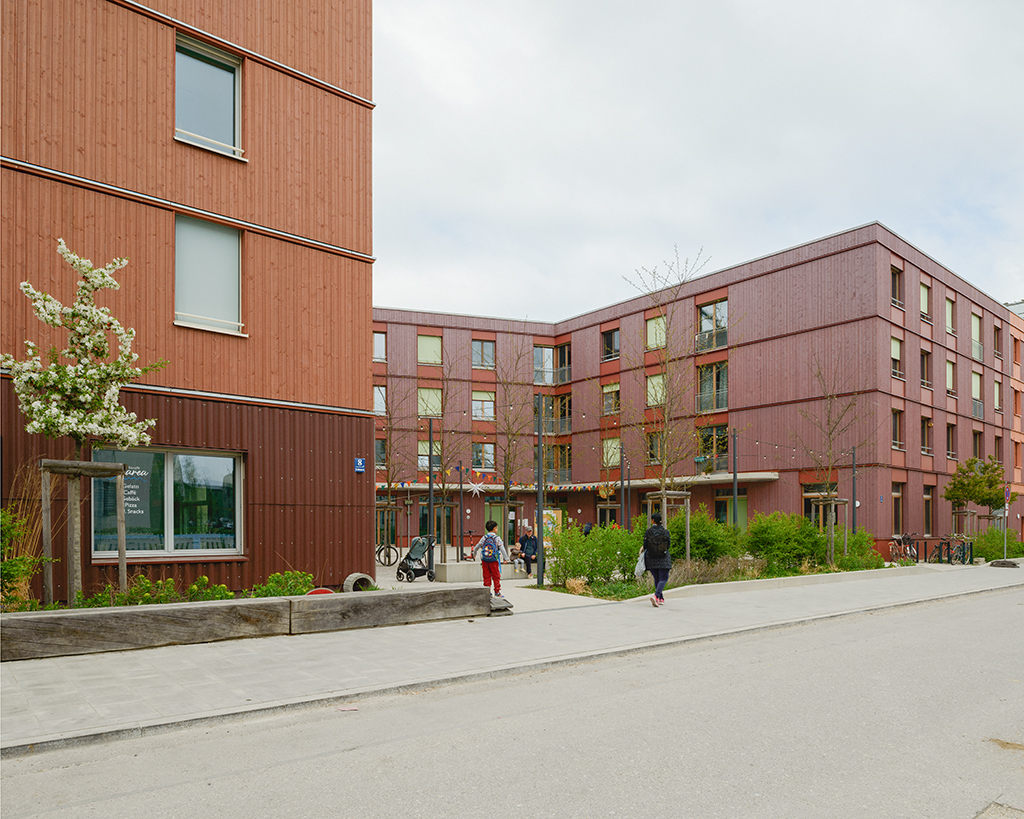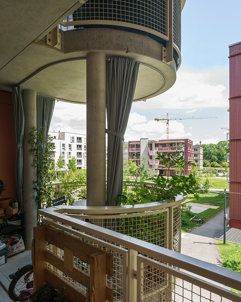Ein ausgeklügelter Wohnungsschlüssel legte die Mischung fest: 90 Prozent Wohnen, davon 50 Prozent gefördert nach dem Münchner Modell, 20 Prozent einkommensorientierte Förderung, 20 Prozent frei finanziert, zehn Prozent Nicht-Wohnen. Der Wohnungsmix enthält verschiedene Wohnungsgrößen, von der 1- bis zur 5-Zimmerwohnung, drei Wohngemeinschaften für einen sozialen Träger finden sich unter den insgesamt 82 Wohnungen. Größere und nutzungsneutrale Räume innerhalb der Wohnungen bieten langfristige Flexibilität für die Bauherrin und die Bewohner*innen im Hinblick auf Aneignung und Anpassbarkeit. Die auf einen Laubengang gelegte Erschließung einer vorgestellten Fertigteilkonstruktion hilft, Kosten zu sparen, die Laubengänge sind aber als kommunikative Elemente zum Innenhof orientiert, an sie sind runde Balkone der Wohnungen angedockt, Vorhänge schützen sie bei Bedarf. Als Konstruktion wird eine Schottenbauweise in Stahlbeton mit Innenwänden aus Trockenbau verwendet. Die Außenhülle ist als selbsttragende Fassade in vorgefertigter Holzständerbauweise mit einer Holzbekleidung konzipiert, ergänzt teilweise mit nichtbrennbaren Fassadenbekleidungen. Die abgestufte farbliche Gestaltung schafft die Vielfalt in der Einheit. Ein modellhaftes Stück Stadtentwicklung ist entstanden, das aus der Genossenschaft eine „Keimzelle der neuen Nachbarschaft“ macht, so heißt es beim BDA Bayern, der das Projekt mit seinem Preis auszeichnete – nachvollziehbar.
