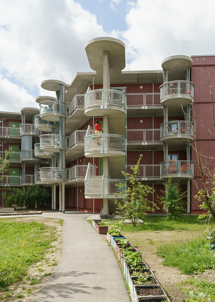 Außenliegende Treppenhäuser, (hier mit Aufzug). Balkone und Erschließung schaffen Bezüge zwischen Privatem und Gemeinschafltichem. (Bild: Markus Lanz, Sebastian Schels)
