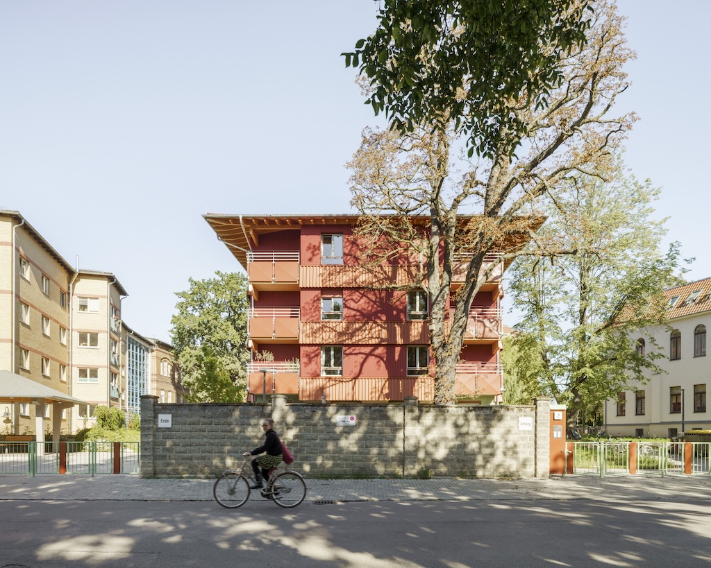 Für das dritte Projekt geht es nach Berlin, in dessen Norden, nach Pankow. Hier hat der SkF e.V. Berlin, der Sozialdienst katholischer Frauen, in direkter Nachbarschaft zu seiner Geschäftsstelle, einem Haus für die Jugendhilfe und einem Wohnhaus vor Kurzem mit einem weiteren Gebäude seinen kleinen Campus kompletiert: mit dem „Haus im Park“, das die bereits bestehenden Angebote für Menschen mit Assistenzbedarf erweitert. Der SkF widmet sich „der Unterstützung von Kindern, Jugendlichen, Frauen und Familien in besonderen Lebenslagen sowie der gleichberechtigten Teilhabe von Menschen mit Behinderungen an der Gesellschaft“. Zwischen den bestehenden Häusern wurde ein 37 Meter langer und bis zu 16 Meter breiter Neubau eingepasst, die Holzfassaden aus sägerauen Brettern der Obergeschosse sind in warmem Rot gehalten, ebenso wie die schräg gestellten Schürzen aus Wellfaserzement, die die Stockwerksfugen überdecken und dabei als Brand- wie als Sonnenschutz dienen. Das weit auskragende Dach sowie die an den Balkonen auskragenden Decken und Wände machen die Konstruktion aus Holz sichtbar und repräsentieren nicht nur die auch sonst aus Holz konstruierten Obergeschosse, sondern auch den Anspruch, auf fossile Energie zu verzichen: Photovoltaik, Solarthermie & Wärmepumpen in Verbindung mit Erdwärmesonden versorgen das Haus mit Strom und Warmwasser.