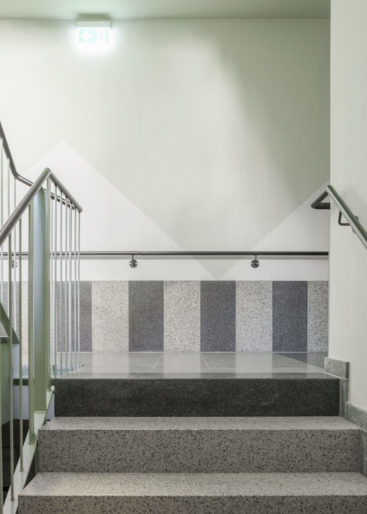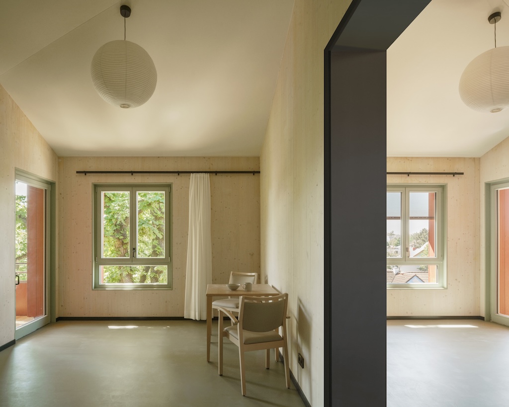 Aber mindestens genauso wichtig: Die auf eine haptische Oberflächenstruktur, klare Gliederung und kräftige Farben basierende Gestaltung vermittelt eine sinnliche Zugänglichkeit und einfühlsame Wärme, die es den Menschen einfach macht, hier ihr eigenes und eigenständiges Leben zu leben. Der massive, grün verputzte Sockel korrespondiert dabei mit den Obergeschossen. Zwei Eingänge, betont mit glänzenden Fliesen, führen ins Innere, von Westen wie von Osten, in den Tagesbereich im Erdgeschoss von der einen und in die Wohnungen in den Obergeschossen von der anderen Seite. Das hilft, die unterschiedlichen Nutzungen zu entzerren. Das Zentrum ist in jedem Geschoss der großzügige Flur – mehr Begegnungs- als Erschließungsfläche; hier findet sich das Rot der Fassade wieder, großflächige Muster erleichtern die Orientierung, im obersten Geschoss krönt eine die Dachkonstruktion fortsetzende Oberlichtlaterne diesen zentralen Raum. In den Holzwänden fällt das Grün der Holzefensterrahmen stärker als von außen auf.