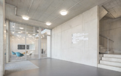 Wie in Kassel ging es auch in Karlsruhe darum, preiswerte Büroräume zu realisieren, auch hier haben Birk Heilmeyer und Frenzel Sichtbetonstrukturen und offenliegende Installationen als aus der Aufgabenstellung geborenes Ausdrucksmittel genutzt: sauber detailliert und räumlich so klar wie vielfältig strukturiert, dass die Veredlung nicht lediglich als Floskel verstanden werden darf, ebensowenig übrigens wie der Begriff des Rohbaus: auf eine hohe Sichtbetonklasse wurde verzichtet. Die exponierten Betondecken werden zur Bauteilaktivierung herangezogen, dafür wird je nach Jahreszeit und Außentemperatur über 15 Erdwärmesonden der Untergrund unter dem Gebäude genutzt, um zu wärmen oder zu kühlen. Die gezielt gesetzten Akzente durch die Möblierung und Beleuchtung halten diese Balance.
