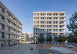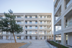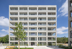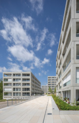 Auch das Entwurfsprinzip verbindet die fünf unterschiedlich hohen und dimensionierten Gebäude miteinander und verbindet sie zu einer Einheit. Umlaufende Balkonloggien aus Betonfertigteilelementen sorgen für eine zwischen dem Außenraum und den Wohnungen vermittelnden Raumschicht. In den Eckbereichen sind die Außenwände der Wohnungen zurückgesetzt, so dass sich in den Diagonalen gerahmte Durchblicke ergeben, die die Überlagerungen von innen und außen noch einmal intensivieren. Stores sorgen für Intimität und Schatten und dafür, dass diese Überlagerungen variieren.
