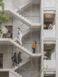 Erschlossen werden die Wohnungen von einem – ebenfalls Kosten sparendem – außenliegenden Treppenhaus, ein Edelstahlnetz übernimmt die Absturzsicherung.