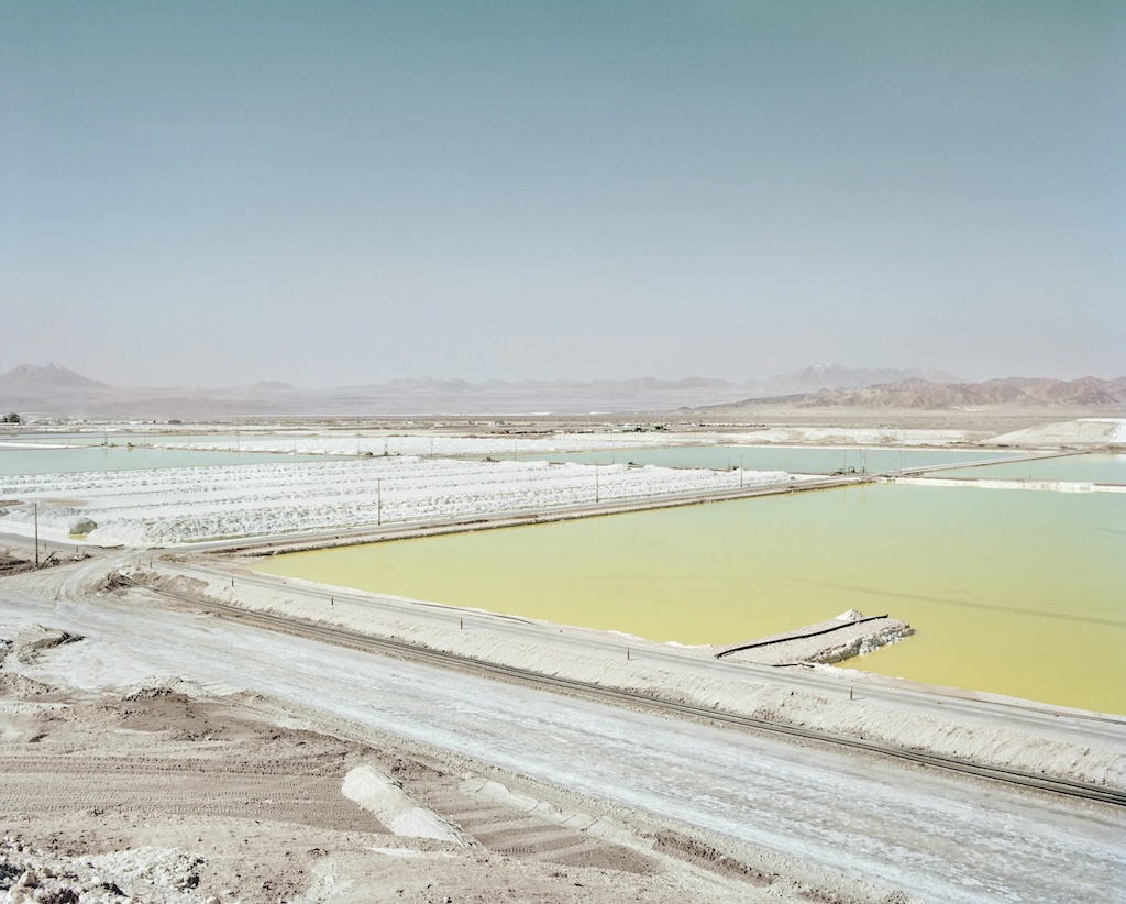 Am Beginn der Ausstellung stößt man auf dicke Stücke von Unterseekabeln, die als Leihgabe vom benachbarten Deutschen Museum stammen. Und man lernt ein neues Wort: Guttapercha steht für ein nicht-wasserlösliches Gummi, das der Ummantelung der früheren Unterseekabel diente. Das erste Kabel wurde 1850 zwischen Dover in Großbritannien und Calais in Frankreich verlegt – allerdings war dieses Kabel bereits wenige Stunden später vom Anker eine Fischerboots unbrauchbar gemacht worden. Beim zweiten Versuch ummantelte man das Kabel mit der aus dem Saft des Guttaperchabaumes gewonnenen Substanz. Dies war der Beginn der globalen Tiefseekabelindiustrie – was allerdings zum Aussterben des Perchabaums in Südostasien führte, da dessen gesamter Bestand für die Ummantelung der Kabel verwendet wurde, so Marina Otero Verzier im Interview in der Publikation. Solche koloniale Extraktionspraktiken stehen beispielhaft für die Geopolitik mit Daten, wie die Autor:innen vor Augen führen – bis heute. Während es früher die Kolonial-Imperien waren, sind es aktuell Big-Tech-Unternehmen wie Amazon, Google, Meta und Microsoft. Der Ausbau von Künstlicher Intelligenz ist direkt mit dem Anstieg der Rohstoffgewinnung wie Seltene Erden, Kupfer, Kobalt und Lithium verbunden. Die Autor:innen des Katalogs kritisieren, dass digitale Infrastrukturen als Teil von grünem Wandel dargestellt werden, wobei man oft ihre umweltschädliche Auswirkungen vergesse. Der Fokus der Ausstellung und Publikation liegt dabei exemplarisch auf Lithium, das den neuen grünen Lebensstil etwa mit Elektroautos erst möglich macht. Die großformatigen und anziehenden Bilder der Atacama-Wüste in Chile von Catherine Hyland führen uns vor Augen, welche Folgen der Abbau von Lithium hat: Der Prozess, bei dem aus tiefen Schichten Salzwasser an die Oberfläche in riesige Becken gepumpt wird, lässt die lokale Landschaft verlaugen und nimmt den Menschen und der Natur die Lebensgrundlage.
