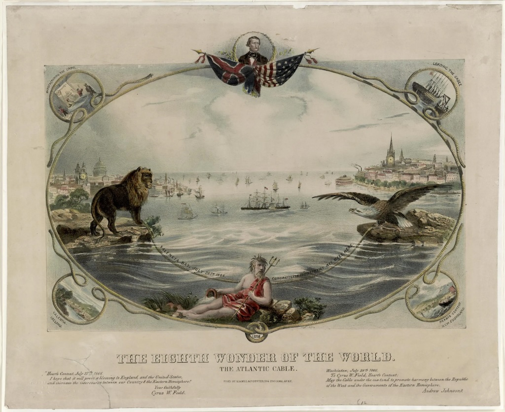 »Das achte Weltwunder«: das Atlantikkabel. Allegorische Szene, die Neptun mit einem Dreizack im Vordergrund zeigt, sowie einen Löwen, der Großbritannien repräsentiert, der das eine Ende des Atlantikkabels hält, und einen Adler, der die Vereinigten Staaten repräsentiert, der das andere Ende des Kabels hält, 1866. (Bild: Library of Congress)