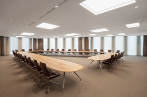 Rund um die große Kundenhalle ordneten die Architekten Büros, Besprechungs- und Konferenzräume an. Dabei stehen jedem Mitarbeiter zehn verschieden Arbeitsplatzsituationen zur Auswahl – eine spezielle Planungsaufgabe auch für den Hersteller Wilkhahn. Während das Anpassen der Konferenztischsysteme Graph, Timetable und Logon auf die individuellen Bedürfnisse des Nutzers zum Alltag gehört, war die Realisierung des als großes, offenes Dreieck gestalteten Graph-Konferenztisches aus Eiche für 32 Personen durchaus eine Herausforderung. Ergänzt werden die Tische durch lederbezogene Graph-Konferenzsessel, deren stützende Blattfeder für eine komfortable dreidimensionale Elastizität sorgt.