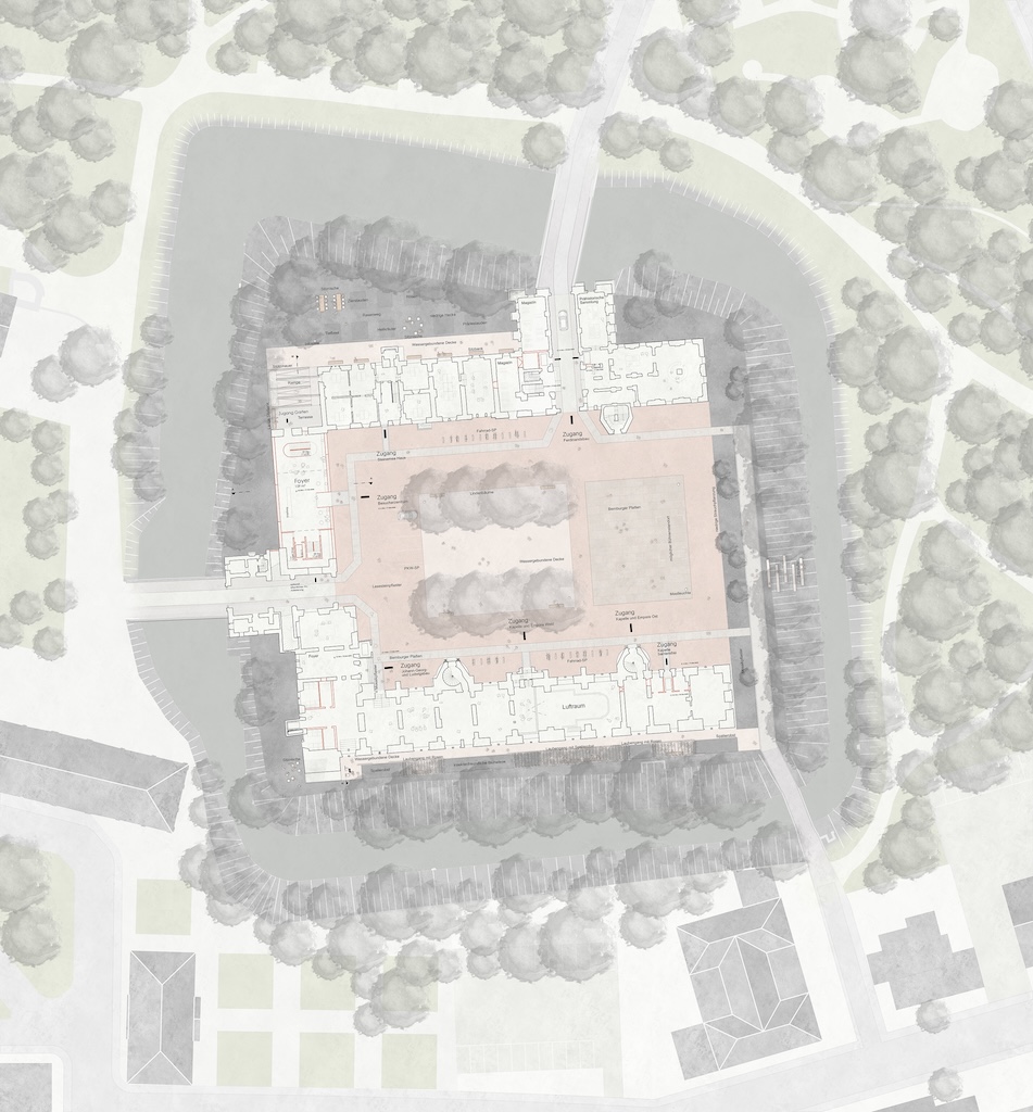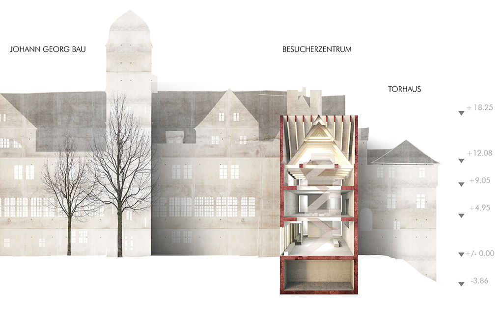 Leitidee des siegreichen Entwurfes ist der seither der vergessene Dachraum des Schlosses, dem keine besondere Bedeutung beigemessen wurde, und der nun museal nutzbar wird. Auch im Entwurf für das neue Besucherzentrums spielt der Dachraum daher eine zentrale Rolle und erschafft einen großen Luftraum mit einer Empore. Hier wird das Stadtlabor einziehen, das flexibel als Konzertraum, Vortragsraum oder Werkstatt bespielt werden kann. Das Dach des Neubaus schließt im selben Material an den Bestand an, sodass Neu und Alt als Skulptur zu einem harmonischen Bild verschmelzen.