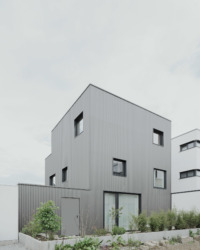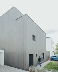 Nicht nur für den Industriebau oder in der Umgebung einer industriegeschichtlich bedeutenden Umgebung ist Metall eine geeignete Alternative – das zeigt das Beispiel eines Einfamilienhauses, das im Großraum Stuttgart entstand. Hier wurde die Fläche, auf der einmal Mineralwasser verarbeitet wurde, zu einem Wohngebiet umgewidmet. Der Bebauungsplan sieht eine dichte Bebauung vor und macht dafür recht rigide Vorgaben. Aus ihnen wurde die Kubatur des Hauses entwickelt: Bebauung bis zur Nordgrenze; nach Westen, zur Straße hin, musste das oberste Geschoss zurückgesetzt werden. Außerdem stand ein Budget von 300.000 Euro netto für die Kostengruppen 300 und 400 zur Verfügung.