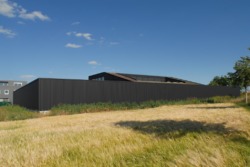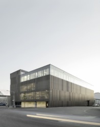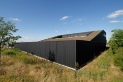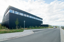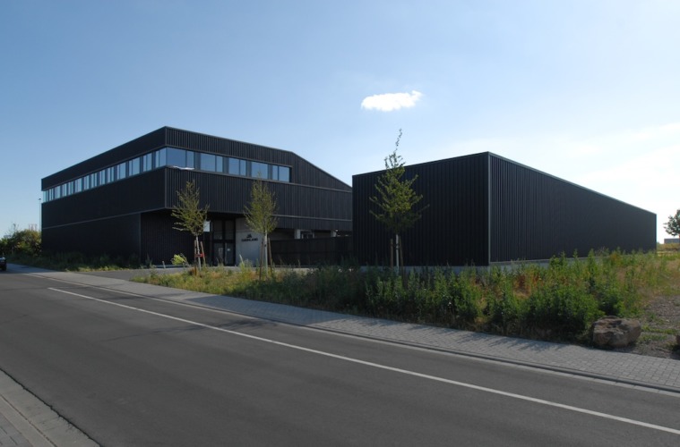 Die schnittige Form wird durch die Gebäudehülle aus dunklem, anthrazitfarbenem Trapezblech betont, das, obwohl ein für den Industriebau übliches Material, dazu beiträgt, das Gebäude als Fixpunkt im Niemandsland des erst vor wenigen Jahren ausgewiesenen Industriegebiets zu verankern.