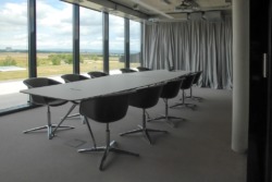 Eine Dachfläche reicht von den Lagerbereichen im Erdgeschoss bis zu diesem Bürogeschoss, so dass der Baukörper von der Straße aus eine überaus dynamische Erscheinung bekommt und das Gebäudeteil, dem sich dieser Handwerkerbetrieb widmet – dem Dach –, gebührende Präsenz verleiht. In diese Dachfläche ist im dritten Obergeschoss eine Terrasse eingeschnitten, für Besucher ist so ebenso wie von außen sichtbar, dass das Dach begrünt wurde – dies auch, um den Bezug zu den Freiflächen des noch wenig bebauten Gewerbegebiets herzustellen.