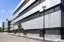 Um die Tragstruktur aus einer Betonrahmenkonstruktion legt sich im Bereich von Parkflächen und Erschließung eine perforierte Hülle aus perlmausgrau pulverbeschichteten Aluminiumblechen; die Büroräume der oberen Gechosse sind verglast. Diese Fasadenkonstruktion wurde geschossweise gespannt und benötigt keine zusätzliche horizontale Unterkonstruktion. Durch das geschossweise Versetzen der Sicken um jeweils ein Segment werden die einzelnen Gebäudeebenen ablesbar und das Fassadenbild belebt.