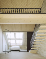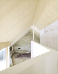 Die Innenräume werden vom Holz dominiert, auf dessen atmophärische Wirkung das Materialkonzept zugeschnitten ist. Der Eichenboden ist weiß geölt, der Galerieeinbau mit abgetöntem Weiß gestrichen, abgestimmt auf das weiß lasierte Birkenholzfurnier der Regalwand, der Kücheneinbauwand und den raumhohen Schiebeelementen, mit denen sich die Küche von Wohnraum und Diele abtrennen lässt. Auch andere Materialien wurden weitgehend ohne Anstriche verwendet: Der Beton der Giebelwand, der schwarze Edelstahl für Geländer, der Jura, mit dem die Ablagefläche der Küche belegt wurde, die sich als Sitzbank und schließlich Sideboard ins Wohnzimmer fortsetzt. Eine Galerie sorgt dafür, dass der Dachraum über die Länge des Gebäudes genutzt werden kann. Kein Wunder, dass diese Aufstockung schon nach knapp dreißig Jahren gewünscht war.