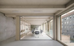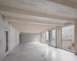Diese Hybridkonstruktion wurde gewählt, weil sie sich in der Summe aller relevanten Einzelaspekte – Bauzeit, Lebensdauer, Energiebilanz – als die günstigste erwiesen hatte. Die Wände sind als tragende Elemente in Sichtbeton vor Ort gegossen worden, in freigehaltene Aussparungen wurden die vorgefertigten Deckenträger aus Kiefernholz eingelegt, auf die zuerst eine Holzplatte gelegt und dann eine Betonschicht aufgetragen wurde – der Fußboden des darüberliegenden Geschosses. Die Fassade wurde mit Lärchenholz bekleidet. Und diese Fassade prägt den Neubau zum Hof hin und gibt ihm bei aller Strenge des Rasters eine wohltuende Freundlichkeit. Das gilt genauso für das Innere: Der Wechsel aus Sichtbeton und den Holzflächen der Decken, Balken und der Fassade sorgen für die Balance aus Wärme und rohem Loftambiente, die die Klientel, die als Mieterschaft infrage kommt, schätzen dürfte. Nicht noch in weitere Oberflächenschichten zu investieren, spart natürlich auch Kosten. Wenn sich das in der Miete niederschlägt, dürften die Nutzerinnen und Nutzer dieses schönen neuen Inlays auch nichts dagegen haben.
