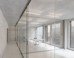 Zu zwei Seiten schließt der Neubau an den Bestand an, nach Westen blieb nur eine kleine Fuge, geöffnet haben die Architekten deswegen den Bau ausschließlich zur Südseite – das aber richtig. Große, geschosshohe Verglasungen sorgen für viel Licht; jedes zweite Fensterfeld erhielt ein Schiebeelement. Der Innenausbau wurde schlicht, reduziert und elegant gehalten. Glas, Holzmöbel und -einbauten, das weiße Geländer vor den Fenstern – und dann eben das Holz und der Beton der unverkleideten Tragkonstruktion.