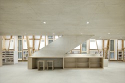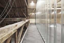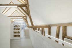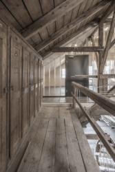 Auf eine chemische Behandlung der Materialien wurde verzichtet, der Einbau so organisiert, dass auch spätere Umnutzungen möglich sind, ohne das historische Gebäude zu beeinträchtigen. Der Kontrast zwischen dem neuen, flächig-ruhigen Raum und dem alten Tragwerk sorgen dafür, dass das eine nicht in Konkurrenz zum anderen tritt.