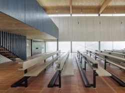 Ein kleine Raumbox mit Nebenräumen wurde mit Biolasur auf Wasserbasis behandelter Seekiefer bekleidet, in ihr liegt das aus Brandschutzgründen mit zementgebundenen Spanplatten verkleidete Treppenhaus, das man über eine neue Außentür auch direkt ohne den Umweg über die Halle erreichen kann, um nach oben in die Schulungsräume zu kommen. Die jungen Segler werden sich allerdings trotz aller Architektenkunst darauf freuen, wie wieder verlassen zu können – soll ihnen doch dort vor allem der Wunsch gestärkt werden, sich auf dem See mit der Kraft des Windes zu bewegen.