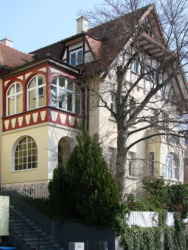 Die Mülbergerstraße war einmal Esslingens erste Adresse. Vom Altstadtkern führt sie, von der Ebershaldenstraße ausgehend, seit den letzten Tagen des 19. Jahrhunderts in den Südhang hinein, um auf halber Höhe eine Kehrtwende zu vollziehen und oberhalb der „Burg“ wieder herauszukommen. Die Villen und Mehrfamilienhäuser, die hier zwischen 1896 und 1926 entstanden, stehen überwiegend unter Denkmalschutz: 16 an der Zahl, die älteren Häuser auf der Talebene nicht mitgerechnet. Bekanntester Architekt und Bauherr sind Paul Bonatz und der Fabrikant Paul Eberspächer, doch bei dem 1925/26 errichteten Bau handelt es sich um einen ein Nachzügler. Die meisten entstanden zu Beginn des 20. Jahrhunderts, als der Straßenzug angelegt wurde: mit der Katharinenstaffel als Querverbindung und einer Grünanlage mit dem Lenaudenkmal in der Kehre.