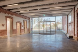 Im Nachhinein scheinen die räumlichen Voraussetzungen für die neue Nutzung als Theater ideal: ein Verbindungsbau zwischen den zwei langgestreckten Bauteilen, der zu einem Foyer erweitert werden kann, die Mischung aus ein- und zweigeschossigen Räumen und dadurch variierende Gebäudehöhen von 3,5 bis 11 Meter, in denen die Theatersaal, Werkstätten, Studiobühne, Lager und Technikräume Platz finden können. Tatsächlich ist es aber die Leistung von Peter Zirkel Architekten, 2021 im VgV-Verfahren genau diese Anpassung des Bestands an die gewünschte Nutzung herausgearbeitet zu haben: Es gilt schließlich überhaupt erst zu sehen, wie ein Bestand so transformiert werden kann, dass er so selbstverständlich neu genutzt werden kann. Mit einer verglasten Front wurde der vordere Innenhof zu einem Foyer erweitert, von dem aus Haupt- und Studiobühne, Gastrobereich mit Küche und Toilettenanlage zugänglich gemacht werden. Gleichzeitig können an den Verbindungsgang Lager, Werkstatt, Technikräume und Künstlergarderoben angelagert werden, aber auch separat erschlossen werden.