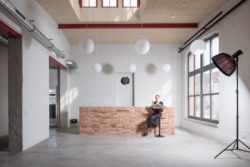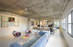 Im Obergeschoss wurden die abgehängten, mit Teppich eingerichteten Handwerker-Einzelbüros in einen offenen Arbeitsraum für die Agentur verwandelt, der durch Licht, Möbel und Ausstattung zoniert wird und immer wieder neu figuriert werden kann; er ist gleichzeitig Arbeits- wie Ausstellungsraum, ergänzt um eine Chill-Ecke und eine blaue Box für Garderobe und Besprechung. Die abgehängte Decke wurde entfernt, so dass nun Sichtbetondecken den Raum prägen. Der Bestandsestrich wurde auch hier gefräst, zusätzlich mit einer Fußbodenheizung versehen und lichtgrau beschichtet. Die weißen Wände geben die Bühne frei für farbige Möbel, eine knallgelbe Küche, ein pinkfarbiges Bad, und die blaue Box.