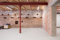 Ansonsten wurde auf die Wirkung der auf den Rohbau zurückgeführten Konstruktion und deren Kontrast zu den neuen Einbauten gesetzt. Die alten Fliesen wurden entfernt, der bestehende Estrich wurde gefräst, blieb aber. Im Bereich der abgebrochenen Bauteile wurde der Estrich neu gegossen und mit einer Zäsur vom bestehenden abgesetzt. Die Betonstützen wurden freigelegt, alle Installationen sichtbar montiert. Ansonsten bieten die kaum veränderten Raumzuschnitte mit weißen Wänden gute Voraussetzung für die Nutzung als Galerie.