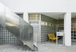 Umgebaut werden sollte der ehemalige Malerbetrieb in Galerie- und Büroräume für die Agentur. Die Aufgabe hat g2o mit einer gut abgewogenen Mischung aus Zurückhaltung und Selbstbewusstsein gelöst. Deutliches äußeres Signet der neuen Nutzung ist eine mit geschlossener Brüstung aus Edelstahl versehene, auffällige Treppe, die nicht nur das Obergeschoss, sondern auch das Dach erschließt – denn die Dachfläche sollte zusätzlich aktiviert werden. Ansonsten ist an der Fassade wenig geändert worden: Die gut erhaltenen Glasbausteine blieben, Tore und Fassaden wurden ersetzt oder etwas dezenter als zuvor neu gestrichen, die Fassadenbeschriftung des Malerbetriebs verschwand. Ein bestehender, vorwitzig auskragender Erker spricht die spielerische Sprache des späten 20. Jahrhunderts – es musste für das Äußere nicht viel neu erfunden werden.