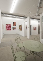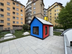 Auf das vorher unzugängliche, bewachsene Dach wurde das Tinyhouse als provozierender Kontrast gesetzt, das die kindliche Vorstellung des freistehenden Einfamilienhauses aufgreift; entworfen hat es der Künstler Richard Woods. Ausgestattet mit einem Bett, von dem aus durch den Schornstein in den Himmel geblickt werden kann, sowie ein kleines Bad, eine kleine Küche, bildet das Minihäuschen den Mittelpunkt eines Dachgartens als einen besonderen Ort für die Besucher:innen von Galerie und Agentur. Als Einheit sind sie eine belebende Überraschung im Hof, in einer Mischung aus sperrigem Bestand und eleganter Umnutzung gerade richtiger Ort, um Kunst zu entdecken.
