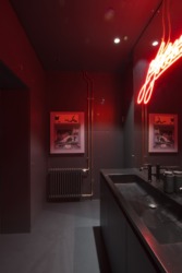 Der Clou der neuen Treppe ist nicht ihr außergewöhnliches Erscheinungsbild, sondern auch, was sie im Innern bewirkt hat. Für diese Treppe sprachen zunächst praktische Gründe – die Galerie im Erdgeschoss, die Agentur im Obergeschoss und das Dach sollten unabhängig voneinander erschlossen werden. Doch gewonnen wurde damit im Innern statt des ursprünglichen Treppenhauses ein über zwei Geschosse reichender Raum, der genau diese Brise des Besonderen und Überraschenden einbringt, um die Gewerberäume zu solchen für die Kunst zu machen. Unterstrichen von linearer Beleuchtung, verbinden sich über diesen Raum die beiden Geschosse miteinander; so wird auch verdeutlicht, dass Galerie und Agentur zusammengehören.