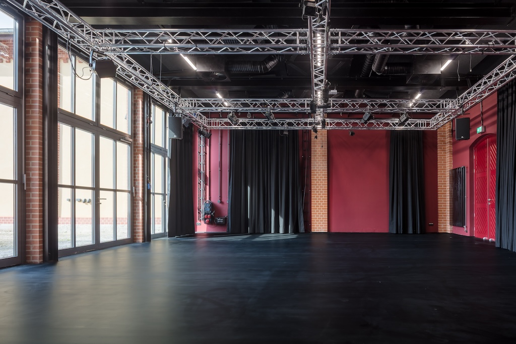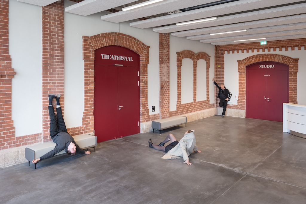 Im Nachhinein scheinen die räumlichen Voraussetzungen für die neue Nutzung als Theater ideal: ein Verbindungsbau zwischen den zwei langgestreckten Bauteilen, der zu einem Foyer erweitert werden kann, die Mischung aus ein- und zweigeschossigen Räumen und dadurch variierende Gebäudehöhen von 3,5 bis 11 Meter, in denen die Theatersaal, Werkstätten, Studiobühne, Lager und Technikräume Platz finden können. Tatsächlich ist es aber die Leistung von Peter Zirkel Architekten, 2021 im VgV-Verfahren genau diese Anpassung des Bestands an die gewünschte Nutzung herausgearbeitet zu haben: Es gilt schließlich überhaupt erst zu sehen, wie ein Bestand so transformiert werden kann, dass er so selbstverständlich neu genutzt werden kann. Mit einer verglasten Front wurde der vordere Innenhof zu einem Foyer erweitert, von dem aus Haupt- und Studiobühne, Gastrobereich mit Küche und Toilettenanlage zugänglich gemacht werden. Gleichzeitig können an den Verbindungsgang Lager, Werkstatt, Technikräume und Künstlergarderoben angelagert werden, aber auch separat erschlossen werden.