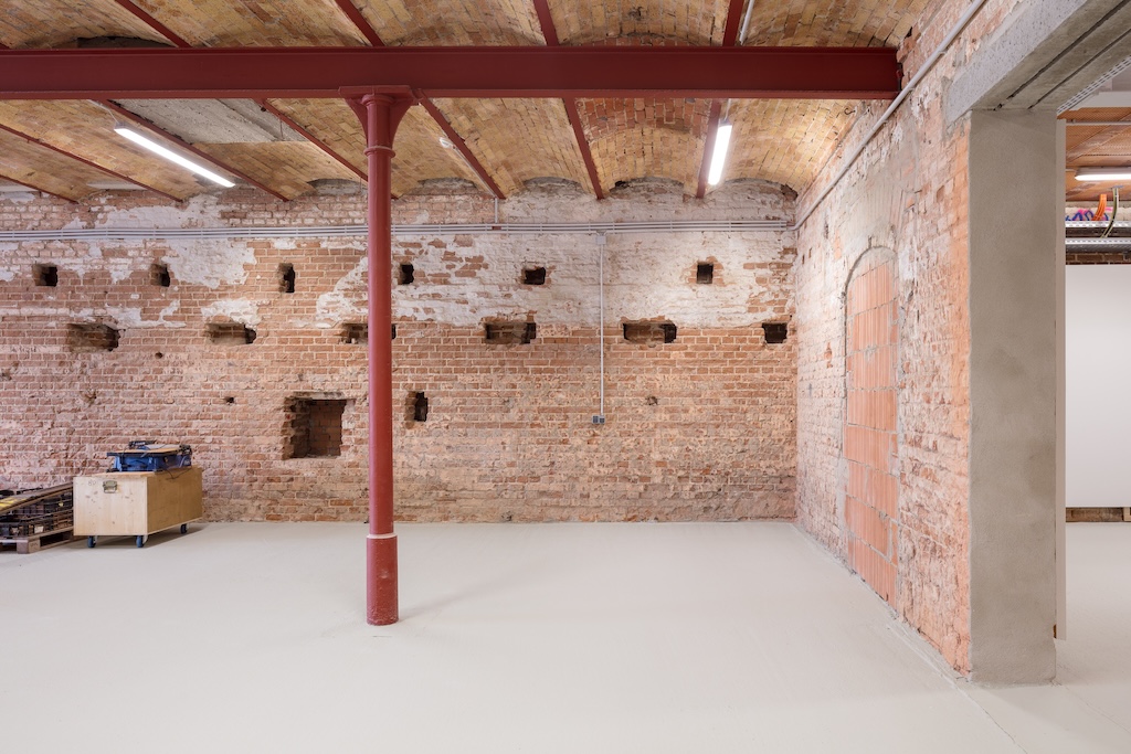 Ansonsten wurde auf die Wirkung der auf den Rohbau zurückgeführten Konstruktion und deren Kontrast zu den neuen Einbauten gesetzt. Die alten Fliesen wurden entfernt, der bestehende Estrich wurde gefräst, blieb aber. Im Bereich der abgebrochenen Bauteile wurde der Estrich neu gegossen und mit einer Zäsur vom bestehenden abgesetzt. Die Betonstützen wurden freigelegt, alle Installationen sichtbar montiert. Ansonsten bieten die kaum veränderten Raumzuschnitte mit weißen Wänden gute Voraussetzung für die Nutzung als Galerie.