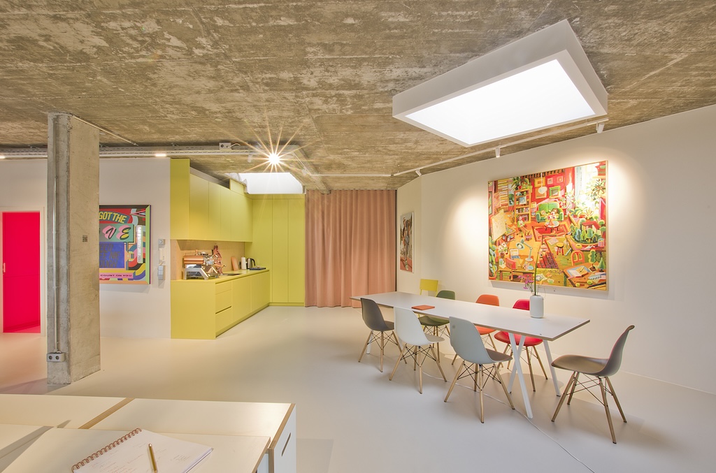 Im Obergeschoss wurden die abgehängten, mit Teppich eingerichteten Handwerker-Einzelbüros in einen offenen Arbeitsraum für die Agentur verwandelt, der durch Licht, Möbel und Ausstattung zoniert wird und immer wieder neu figuriert werden kann; er ist gleichzeitig Arbeits- wie Ausstellungsraum, ergänzt um eine Chill-Ecke und eine blaue Box für Garderobe und Besprechung. Die abgehängte Decke wurde entfernt, so dass nun Sichtbetondecken den Raum prägen. Der Bestandsestrich wurde auch hier gefräst, zusätzlich mit einer Fußbodenheizung versehen und lichtgrau beschichtet. Die weißen Wände geben die Bühne frei für farbige Möbel, eine knallgelbe Küche, ein pinkfarbiges Bad, und die blaue Box.