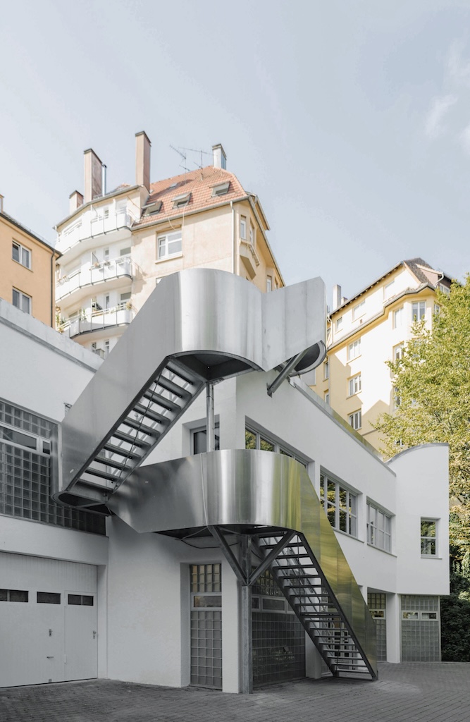 Umgebaut werden sollte der ehemalige Malerbetrieb in Galerie- und Büroräume für die Agentur. Die Aufgabe hat g2o mit einer gut abgewogenen Mischung aus Zurückhaltung und Selbstbewusstsein gelöst. Deutliches äußeres Signet der neuen Nutzung ist eine mit geschlossener Brüstung aus Edelstahl versehene, auffällige Treppe, die nicht nur das Obergeschoss, sondern auch das Dach erschließt – denn die Dachfläche sollte zusätzlich aktiviert werden. Ansonsten ist an der Fassade wenig geändert worden: Die gut erhaltenen Glasbausteine blieben, Tore und Fassaden wurden ersetzt oder etwas dezenter als zuvor neu gestrichen, die Fassadenbeschriftung des Malerbetriebs verschwand. Ein bestehender, vorwitzig auskragender Erker spricht die spielerische Sprache des späten 20. Jahrhunderts – es musste für das Äußere nicht viel neu erfunden werden.