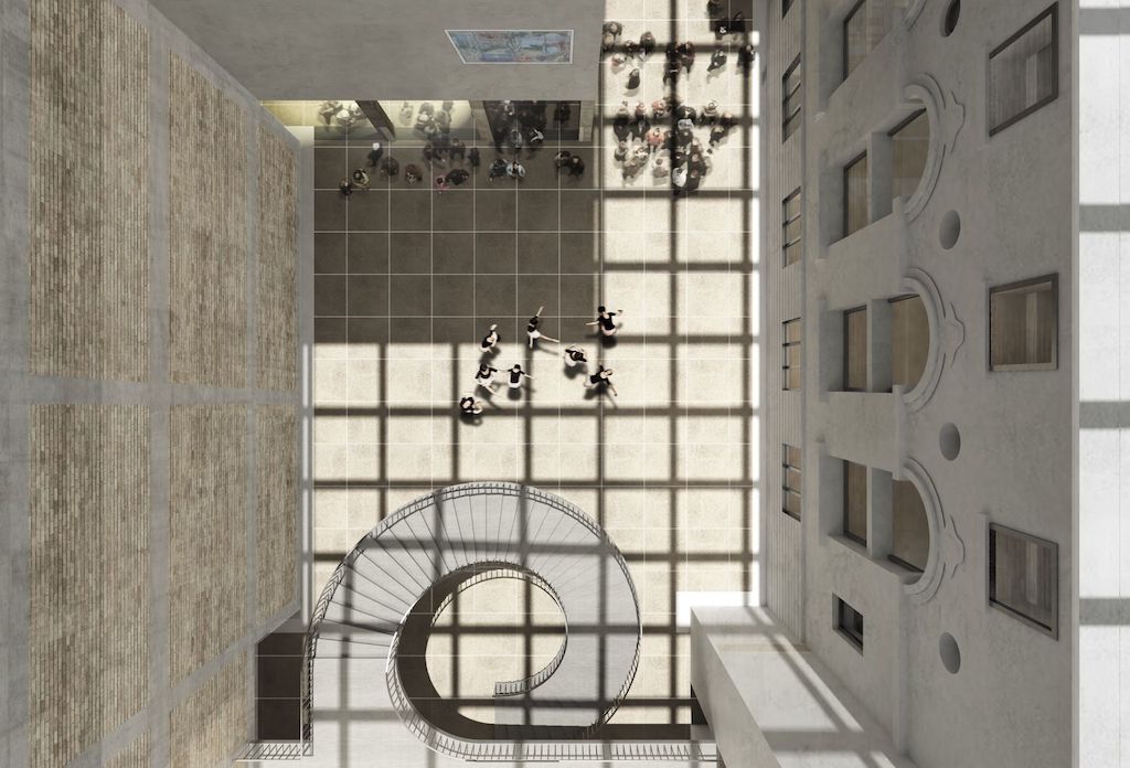 Entwurf für einen Umbau der bestehenden Anlage unter weitgehender Erhaltung des Bestands. Masterarbeit von Sofie Hoyer von 2018. Blick in die Passage. Weitere Information zum Entwurf >>>