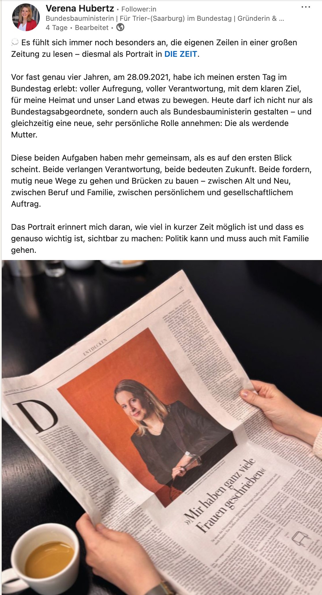 7) Tina Hildebrandt:Ein Treffen mit Bundesbauministerin Verena Hubertz, in: DIE ZEIT, 25.9.2025