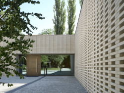 Das ist eine Aufgabe, für die Fingerspitzengefühl erforderlich ist. Aber nicht nur. Ein Krematorium stellt zum einen die Anforderung, Menschen in Stunden des schweren Abschieds eine angemessene Umgebung anzubieten, die ihnen hilft, einen schweren Verlust zu bewältigen. Und es müssen technische Anlagen untergebracht und funktional geordnet werden. Im Münchener Ostfriedhof war von Hans Grässel eine Trauerhalle mit Krematorium 1927–29 errichtet worden, das in den 1970ern durch einen Neubau ergänzt wurde, in dem seither die Einäscherungen vorgenommen wurden. Nach einigen Abwägungen wurde entschieden, diesen späteren Bau durch einen Neubau zu ersetzen, der nicht nur der Einäscherung dient, sondern auch Räume zur Verabschiedung und Aufbahrung aufnehmen sollte. Mit Grässels Trauerhalle sollte der Neubau eine neue Einheit bilden. In einem Wettbewerbs-Verfahren konnte sich der Entwurf von Beer Bembé Dellinger durchsetzen. Sie nutzen in einem Gebäude über dreieckigem Grundriss das zur Verfügung stehende Baufeld nahezu vollständig aus. Der flache Bau mit der sandfarbenen , hell-warmen Ziegelfassade fügt sich dezent in die Parklandschaft des Friedhofs. Ein offener Hof sorgt dafür, dass Neu und Alt miteinander in Dialog treten können, ohne dass einer der Bauten seine Eigenständigkeit verliert. Dieser Hof wird an seiner Rückseite von der Verbindung zwischen Trauerhalle und Krematorium begrenzt, die an den Querflügel der Trauerhalle anschließt und die dahinter liegende Anlieferung abschirmt.