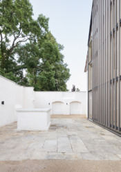 Das Ergebnis ist eine wunderbar sensible, zurückhaltende wie heitere Atmosphäre eines Hauses, das nicht nur G-otteshaus, sondern auch Ort für weltliche Trauerfeiern und neue Mitte für andere Begegnungen geworden ist. Dafür wurde die Kirche nur über einem Teil der Grundmauern errichtet, der breitere Ostteil (der 2018 nicht überdacht worden war) wurde als ein der Kirche angelagerter Hof angelegt, der Raum für Veranstaltungen im Freien bietet. Die alte Raumkonfiguration bleibt erlebbar, die ursprünglichen Fensteröffnungen wurden geschlossen, aber so, dass sie als Relief ablesbar bleiben. Die an den Hof angrenzende Stirnwand der Kirche wurde über die ganze Gebäudehöhe verglast, so dass auch auf diesem Weg das Innen und das Außen in den Dialog miteinander treten können. Sie bekamen eine filternden Schicht aus Holzlamellen, die innen innerhalb der Pfosten-Riegel-Konstruktion leicht gedreht und hell, nach außen grau lasiert wurden. Neue Fenster wurden eingesetzt, teilweise unter Verwendung der ursprünglichen Wandungen. Die Glasflächen der Fenster sind, anders als die der alten Kirche, ungeteilt. Die Giebelwand im Westen ist mit grauer Lärche geschlossen.