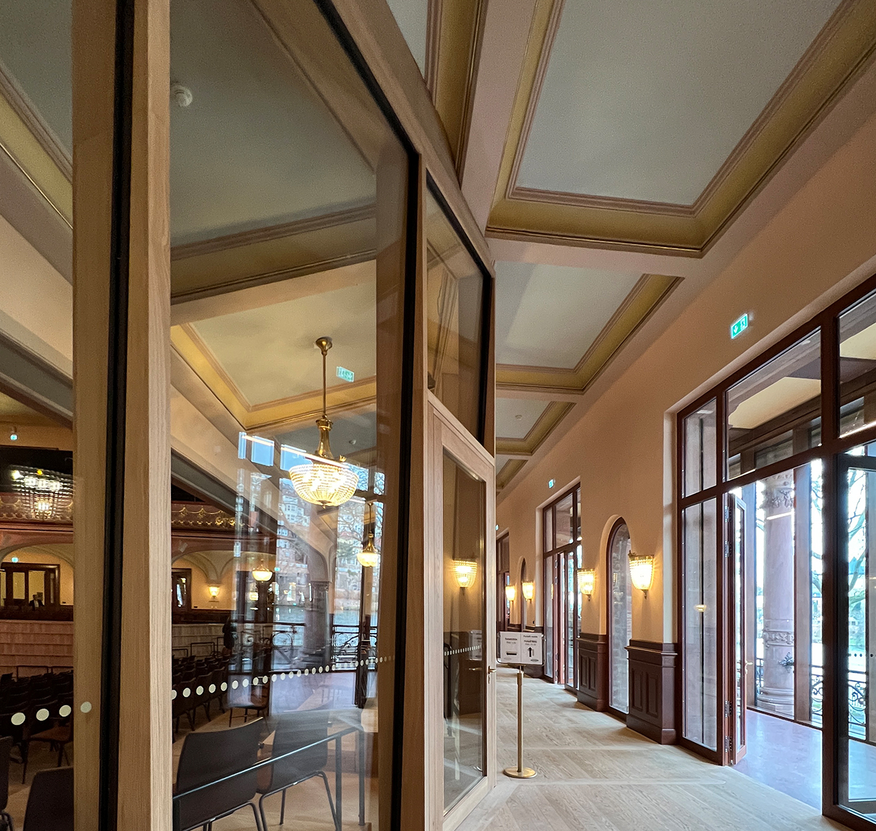 In den Treppenhäusern ist eine kostentreibende Zusatzinstallation zu sehen, die hierzulande leider omnipräsent nachgerüstet werden muss. Geländer in Altbauten werden von Bauordungsgetreuen generell als zu niedrig eingestuft, simple Erhöhungen genehmigt die Denkmalpflege in der Regel nicht. Dann müssen Geländer zusätzlich gebaut werden, höher und mit zusätzlichen Handläufen obendrein. Das haben Waechter + Waechter in der Stadthalle elegant und formal ansprechend gelöst.