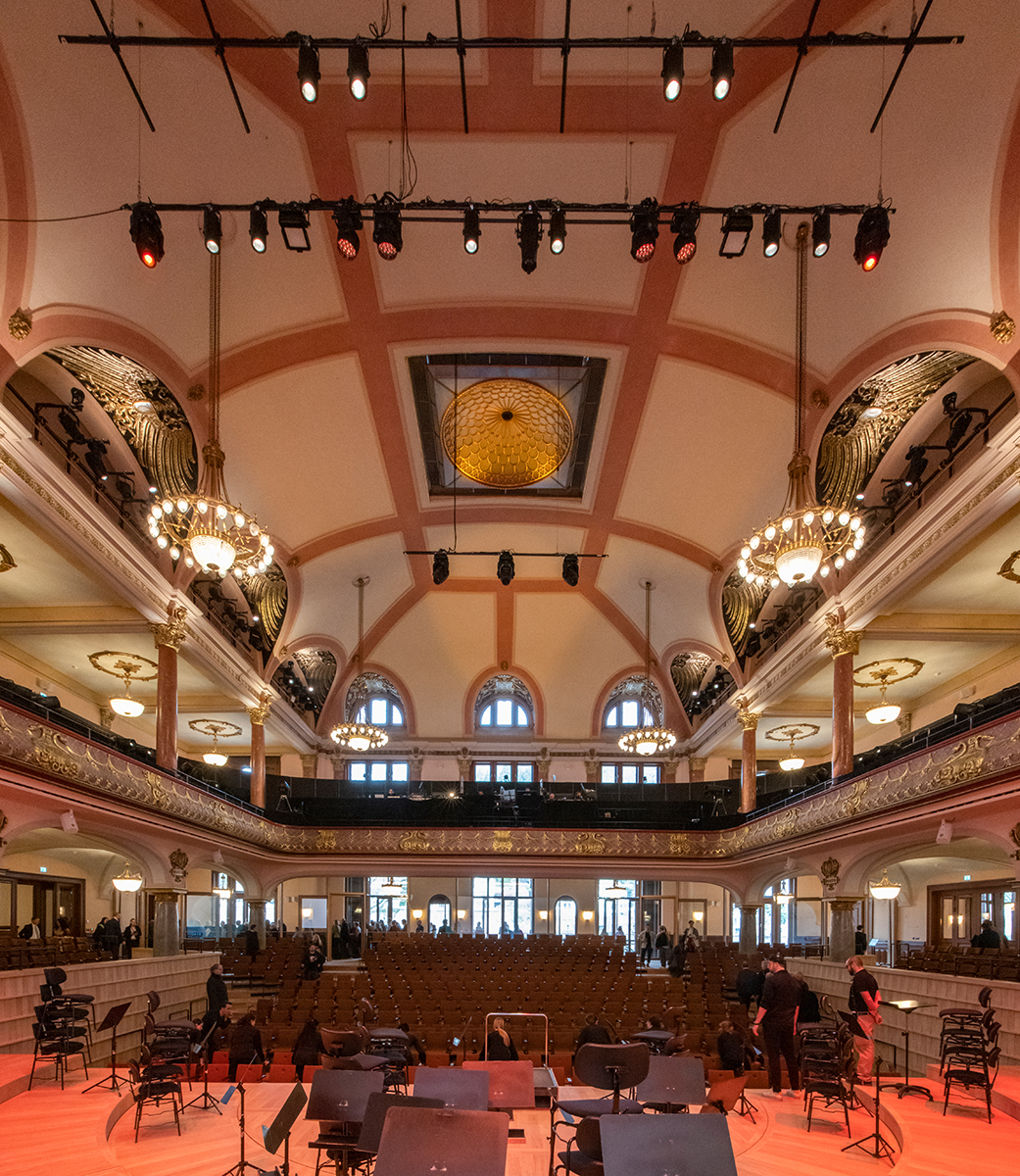 Die technischen Installationen unter der Decke werden noch durch Schallsegel ergänzt. Farbiges Licht ist heute (leider) gang und gäbe. Und dazu schweigt die Denkmalpflege, denn wenn sie aus etwa 16 Farbschichten eine Wandfarbe wählen muss, obliegt ihr kein Einfluss mehr auf das farbige Kunstlicht, mit dem anschließend Shows inszeniert werden – oft bar jeden Verstandnisses von Raumformen und -farben. Das war auch am Eröffnungstag so, als auf einmal Rosa dominierte, als käme eine Barbie-Show zur Aufführung. (Bild: Wilfried Dechau)
