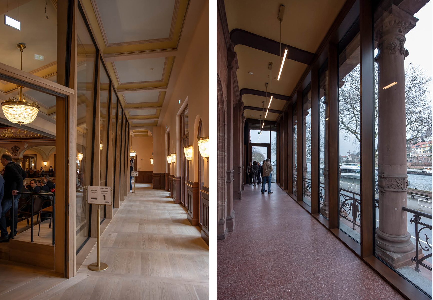 Die Architekten Waechter + Waechter korrigierten dieses Manko durch drei grundsätzliche Entscheidungen: Das eigentliche Musikerpodium wurde aus seiner akustisch ungünstigen Nische nach vorne verlegt. Zum zweiten ist die flexible Nutzung des Hauptsaals durch differenzierte Hubbühnenkonstruktionen erreicht worden. Und zum dritten entstand zwischen dem neckarseitig jetzt verglasten Portikus und einer zum Saal hin eingezogenen Glaswand ein Umgang, der innenräumlich die Seitenbereiche erschließt. Das alles fügt sich jetzt zu schlüssiger Funktionalität.